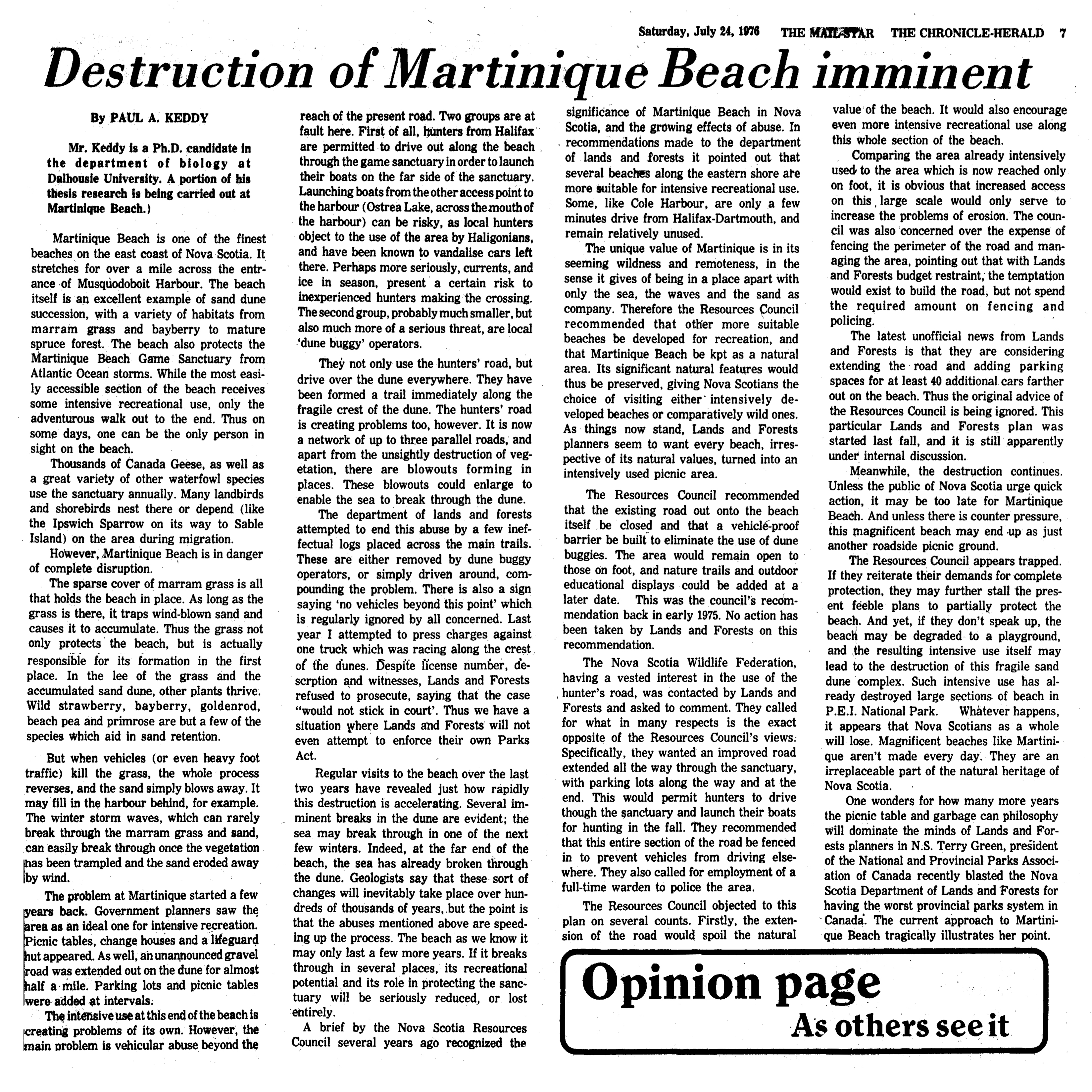 - Keddy, P. A. 1976. Destruction of Martinique beach imminent. The Chronicle Herald (Opinion page, Saturday July 24, Halifax, Nova Scotia) page 7. (Download PDF)